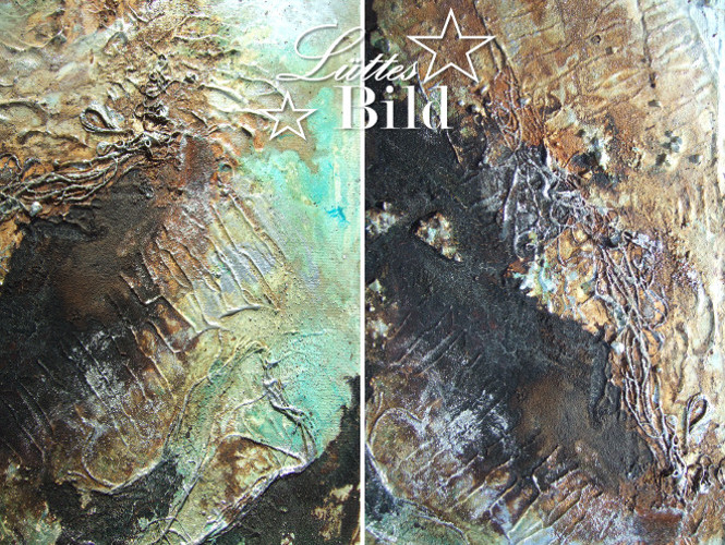 Und wenn Ihr Euch nun fragt, wo mein Bild gerostet wurde, dann seht Euch mal die bräunlichen Bereiche an. Dort wurde Eisenpulver aufgebracht, und durch das Besprühen mit Essig oxidiert. Außerdem hab ich noch mit einigen anderen metallhaltigen Produkten und Oxidationsmitteln, die man im Künstlerbedarf erwerben kann, gearbeitet.