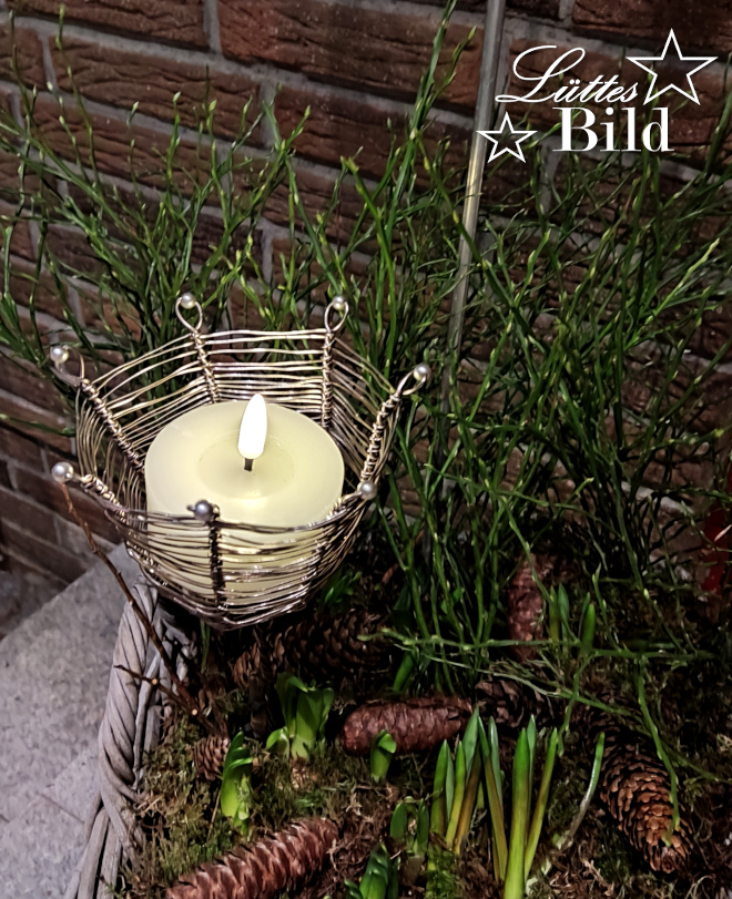 Zusätzlich kamen meine selbst gemachten Teelichthalter und einige Zapfen in die Körbe und ich deckte das Ganze noch schön mit Moos ab. Für die Höhe steckte ich Zweige von der Heidelbeere dazu, hatte dann aber eine zusätzliche Idee, nämlich pro Korb einen dekorierten Drahtring.