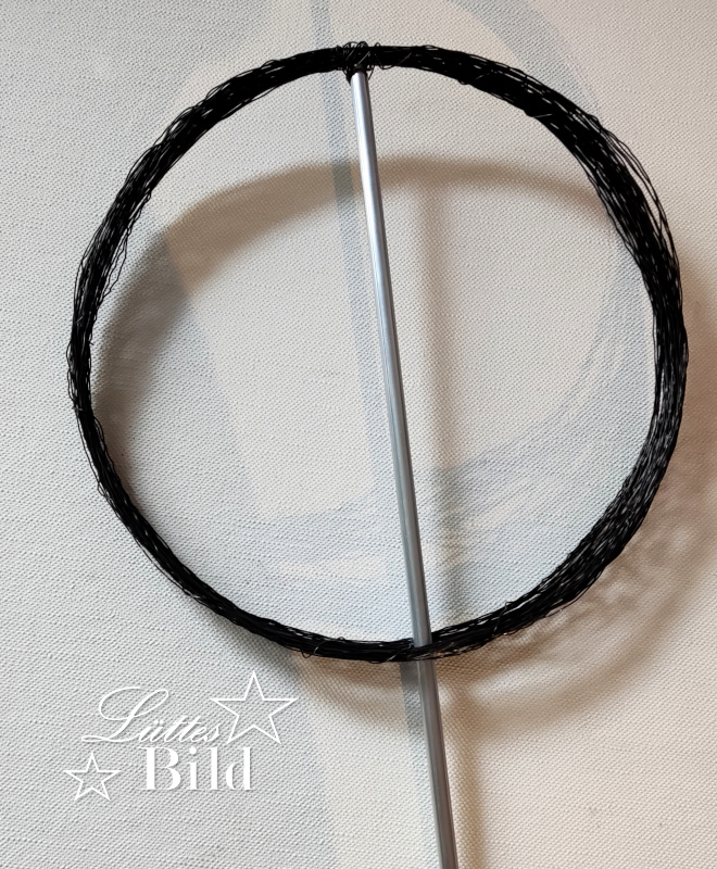 Mit dem letzten Stück Draht fixiert man den Draht und befestigt den Ring dann an einem Stab. Ich habe dafür einen Aluminiumstab genutzt, in den ich am obernen Ende ein Loch gebohrt habe, um dort den Ring gegen abrutschen zu sichern.
