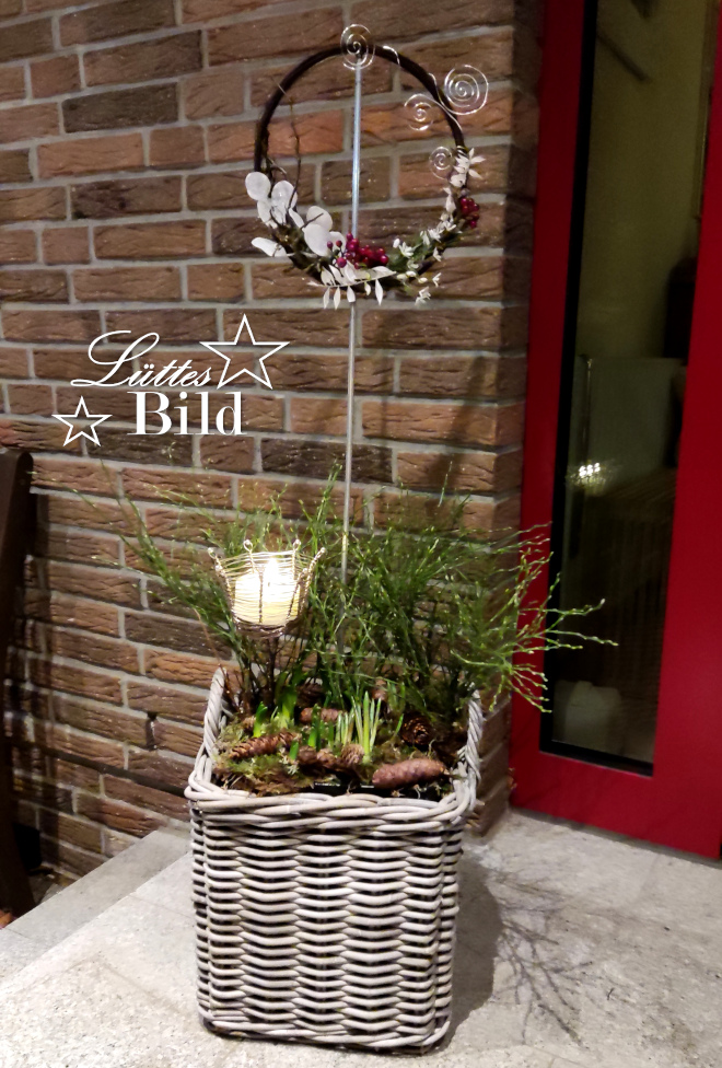 Ich hatte vor meiner Haustür zwei schöne Körbe, bepflanzt mit großen Gräsern und das Ganze weihnachtlich dekoriert. Aber nach dem Frost und dann dem Sturm der letzten Wochen sahen meine Gräser doch arg zerfleddert aus und Weihnachten ist ja auch definitiv vorbei, also musste etwas anderes her. Kurzerhand bepflanzte ich die Körbe neu mit vorgezogenen Frühblühern, Hyazinthen, Narzissen und Traubenhyazinthen. Keine Ahnung, ob die die nächste Frostperiode überstehen werden, aber Versuch macht ja bekanntlich klug.