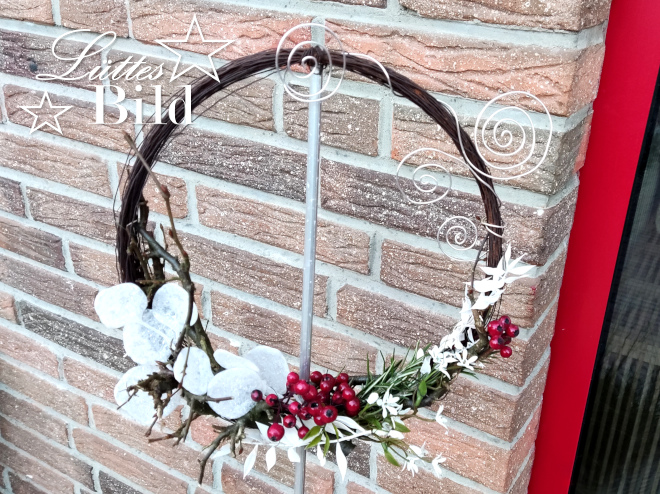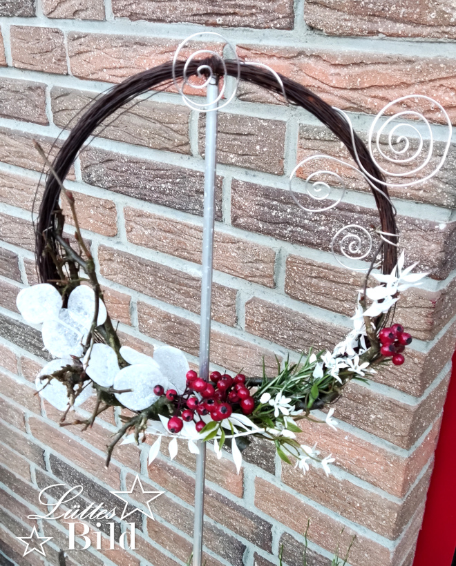 Mit verschiedenen Materialien habe ich den Ring anschließend dekoriert. Ich habe mich dafür entschieden, die Materialien anzudrahten, dafür hatte ich ja noch die zweite Drahtrolle. Man kann hier natürlich auch Heißkleber verwenden, der bleibt aber bei wechselnden Temperaturen nicht beständig und den Draht kann ich später wieder unfallfrei entfernen, um die Ringe umzudekorieren.